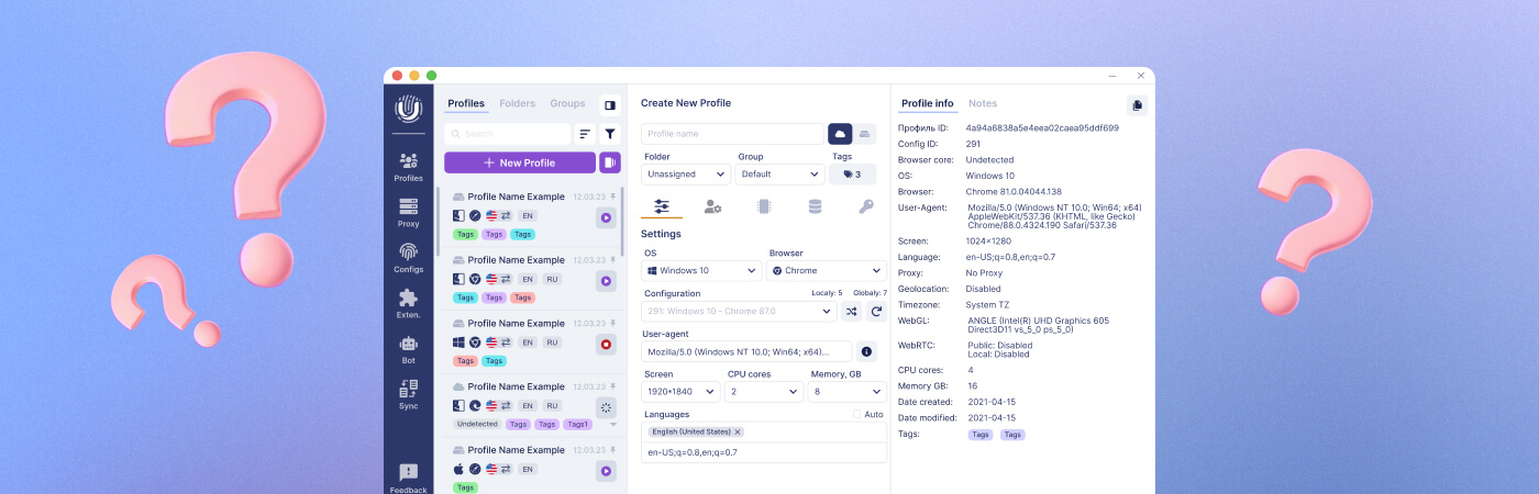 Every browser has a unique digital fingerprint, which includes details like the browser version, operating system, screen resolution, language settings, and more. An anti-detect browser alters these parameters and creates a unique, isolated profile for each account. This allows you to run multiple browsers on the same computer, each entirely distinct from the others in characteristics and data, with no overlap.