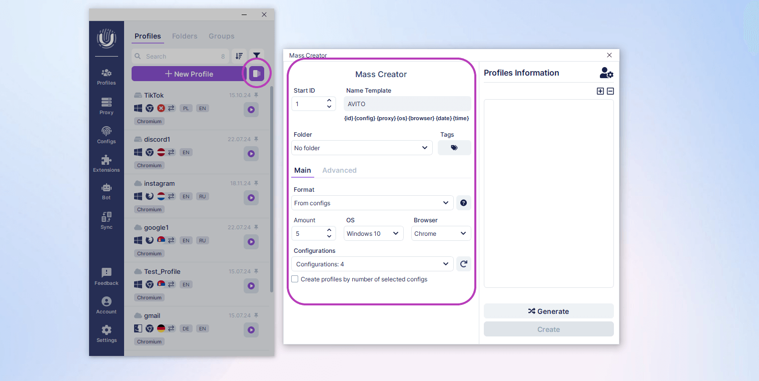 To create multiple accounts, Undetectable offers a bulk profile creation feature. Follow these simple steps to set up profiles effectively: