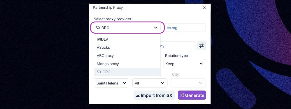 Estamos ampliando la lista de servicios de proxy asociados: ¡en Undetectable ahora se ha integrado el servicio SX.ORG. Genere proxies directamente desde el programa, sin necesidad de visitar el sitio del socio y ahorre tiempo.