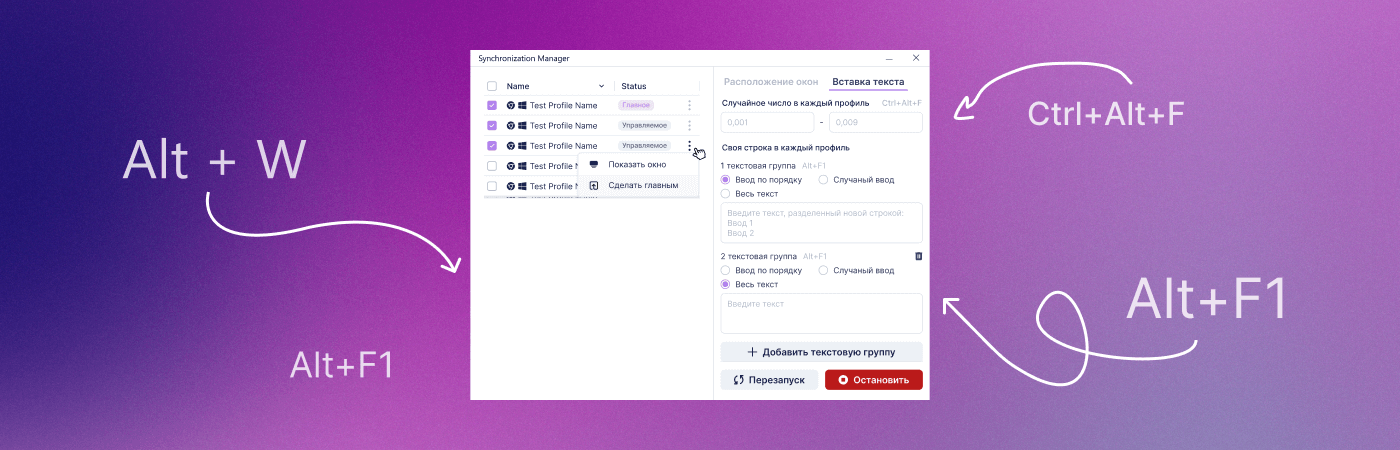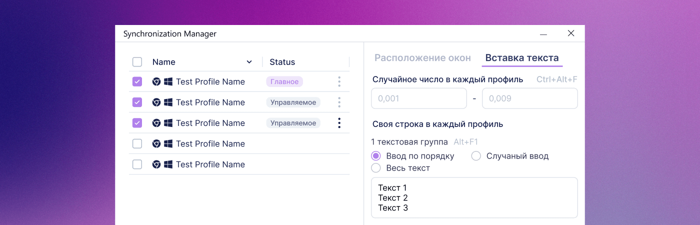 Simplemente ingrese las líneas necesarias en el campo designado y al activar la tecla de acceso rápido cada línea se insertará en un perfil separado secuencialmente o al azar. Esto ayudará a hacer, por ejemplo, el ingreso de logins o contraseñas únicos durante el registro de monederos criptográficos de forma rápida y sin errores, eliminando la necesidad de entrada manual.