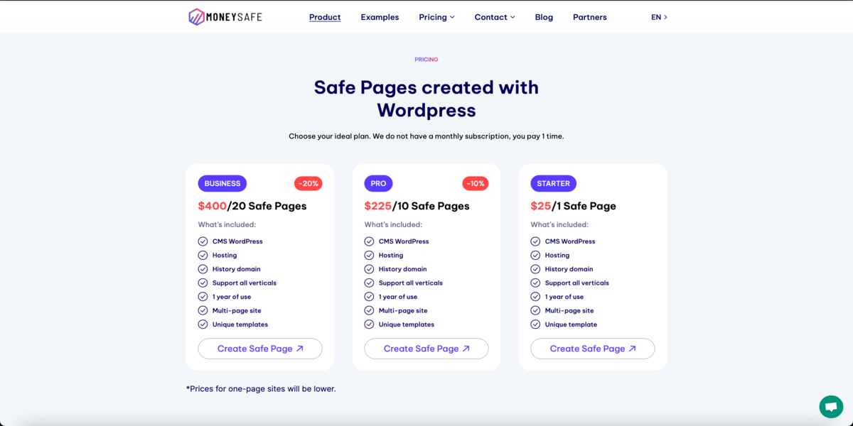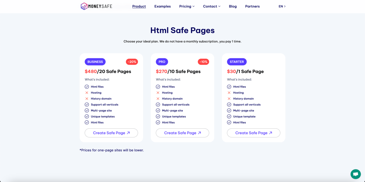 Money Safe n'a pas d'abonnement mensuel, ce qui est très agréable. Le client ne paie qu'une seule fois. Il existe une petite variété de tarifs : Starter, Pro et Business, ils diffèrent seulement par le fait qu'un forfait est basé sur CMS WordPress, et le second - sur des fichiers HTML.