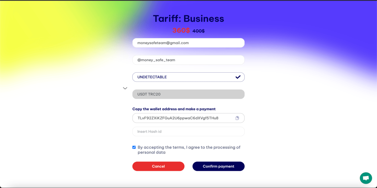 - Cliquez sur le bouton "Créer une page sécurisée" et vous serez redirigé vers la prochaine fenêtre, où vous devrez spécifier des informations brèves - e-mail, contact pour la communication, puis insérer le code promo UNDETECTABLE et choisir le mode de paiement. Actuellement, le service Money Safe n'accepte que les paiements en cryptomonnaie. Ensuite, effectuez un transfert en fonction des détails fournis, insérez l'identifiant de hachage (pas nécessaire), acceptez les termes et conditions, puis confirmez le paiement.