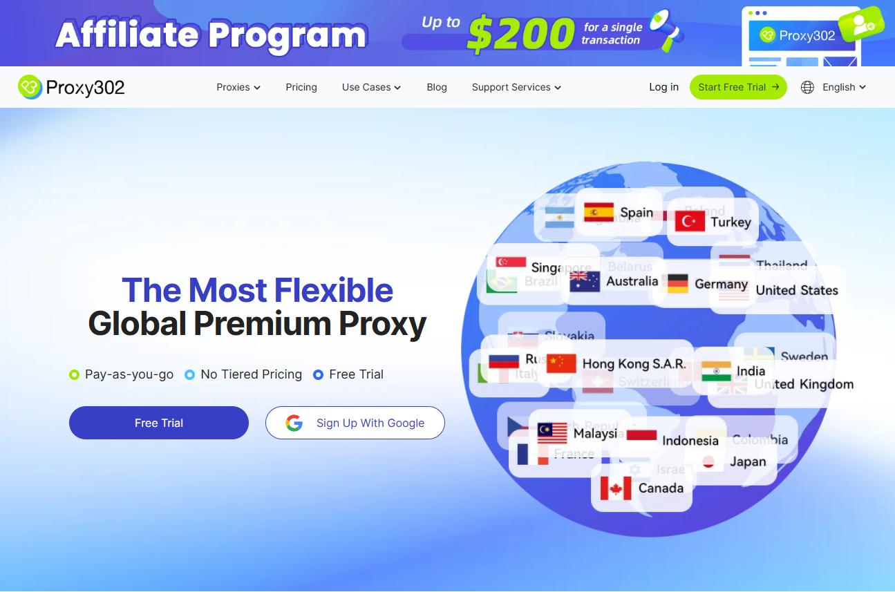 Proxy302は、ペイアズユーゴーサービスを提供するグローバルプロキシを提供するIPセルフサービスマーケットプレイスです。様々なプロキシタイプとそれらを支払う方法を提供しています。240以上の国に2,000以上のサーバーを持ち、世界中のさまざまなニーズに応えています。(無料トライアルあり)