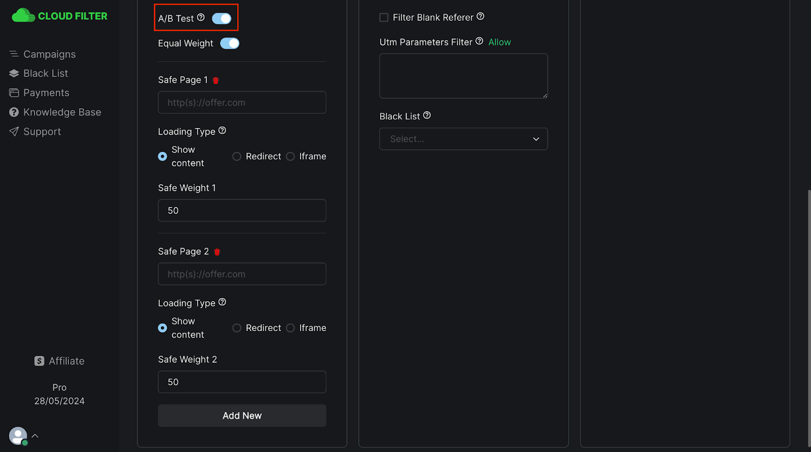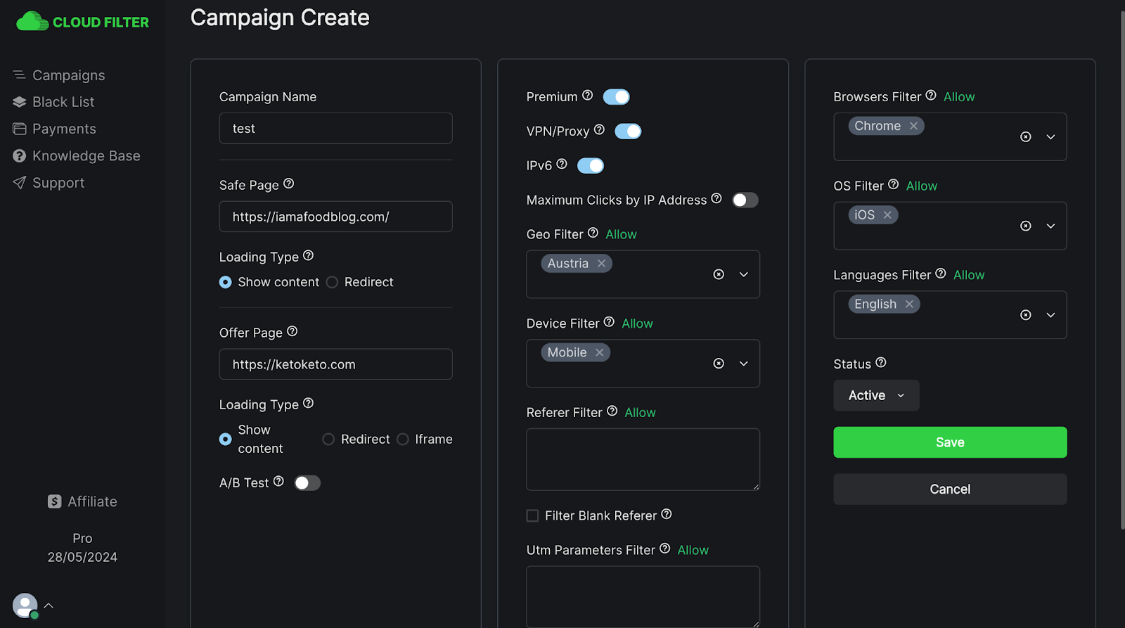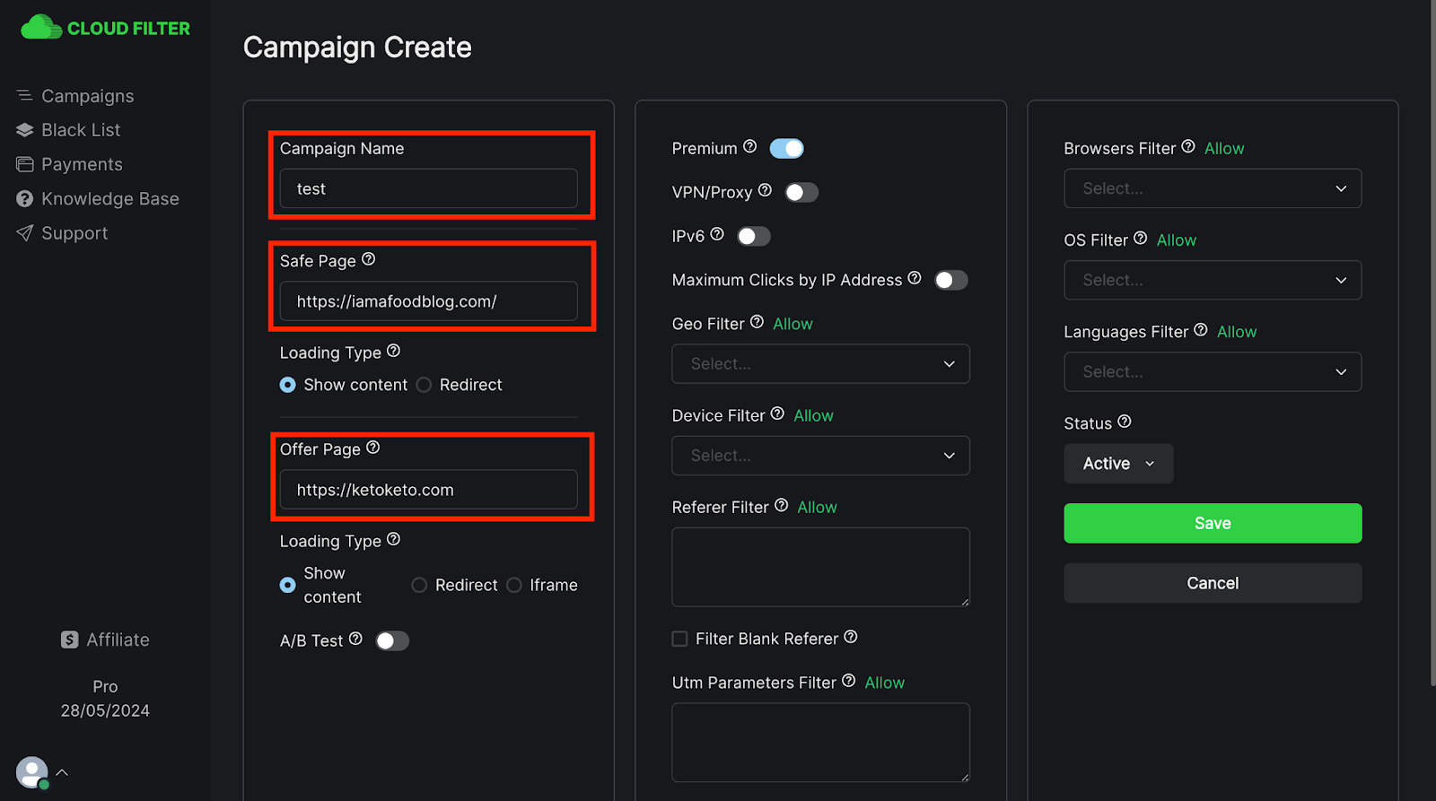Fill in the information about your campaign, including the name, the link to the Safe Page (for unwanted traffic), and the link to the Offer Page (for target users).