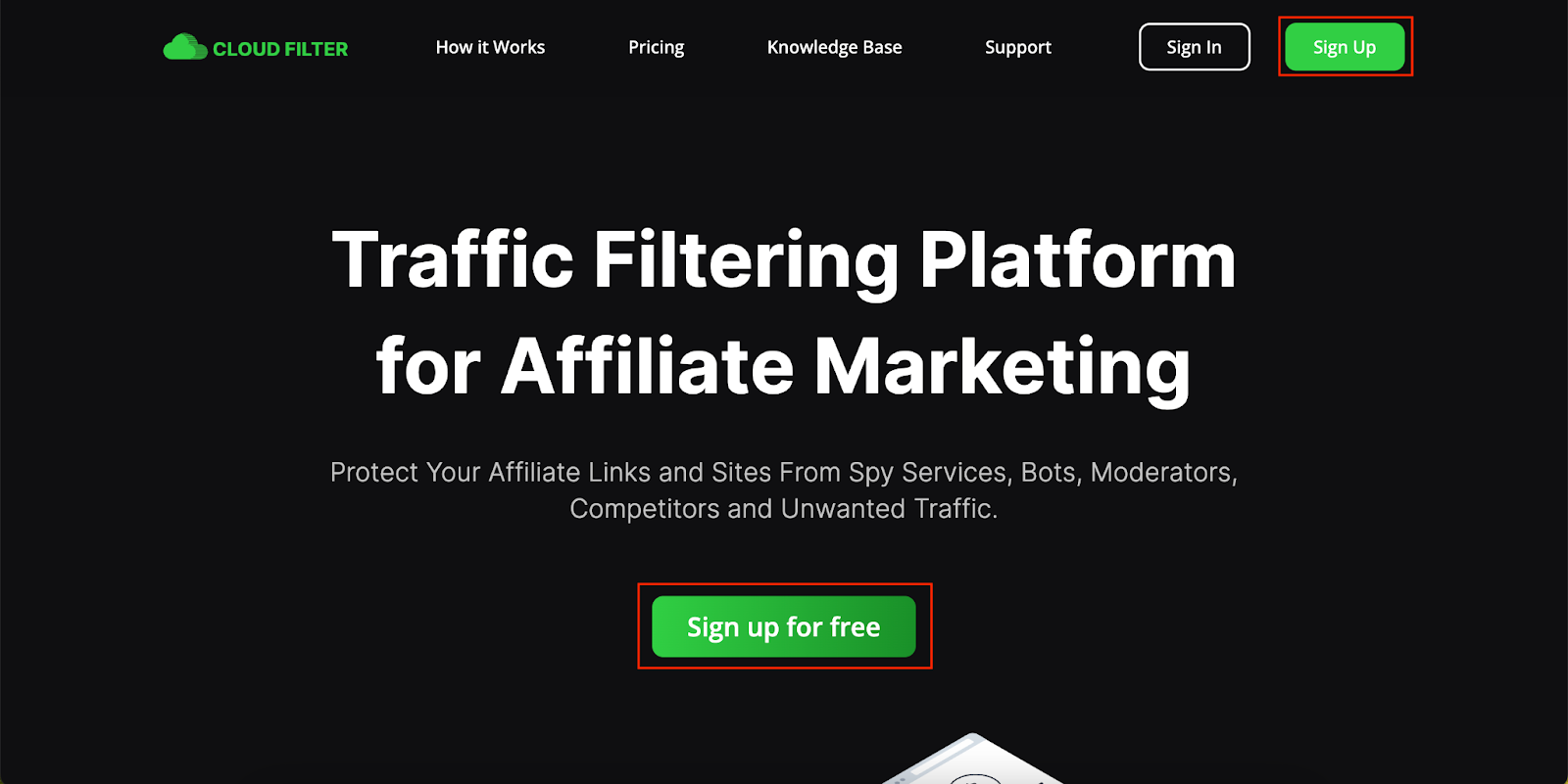 On the homepage, you can learn about the benefits of the service, partners, pricing plans, and a knowledge base. To start using Cloud Filter, you need to register.