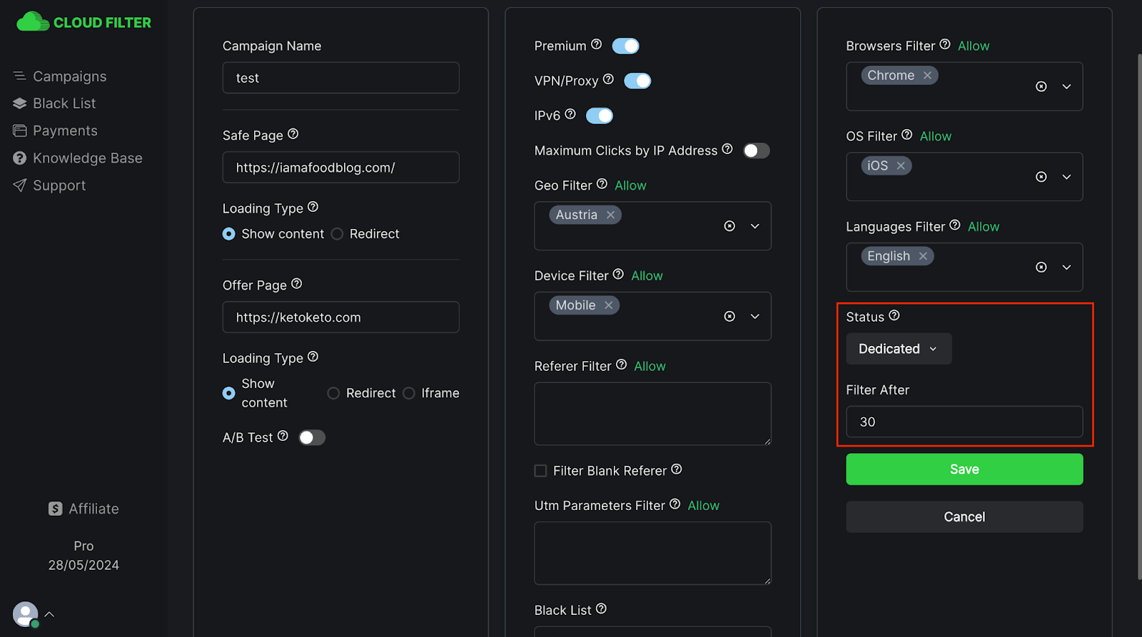 If needed, you can enable additional filters such as IPv6, VPN/Proxy, maximum clicks per IP address, geo, devices, etc.