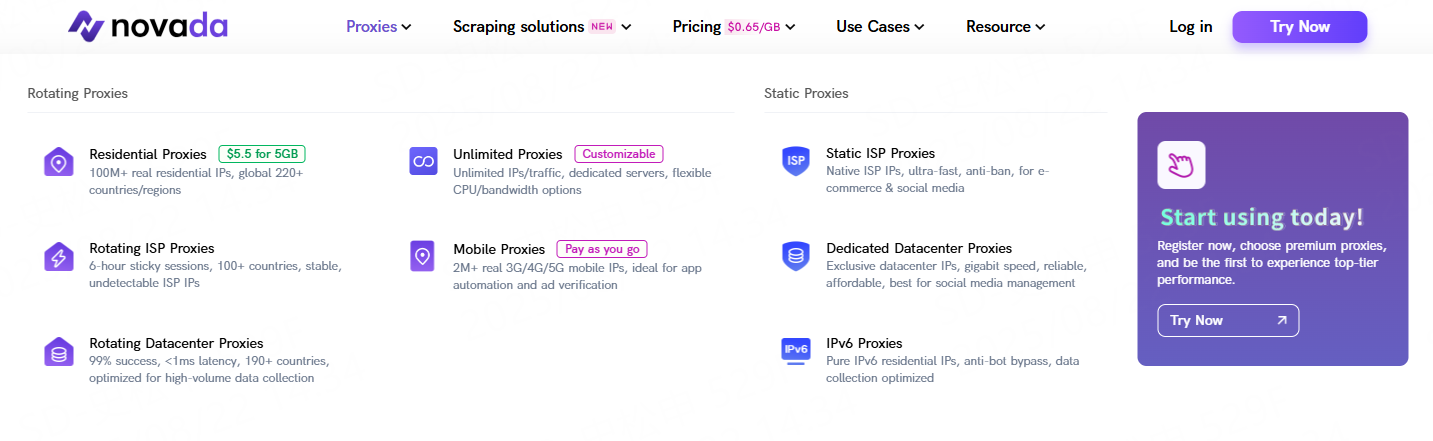 - Datacenter Proxies: Known for their advantages of "high throughput, high efficiency, and low cost," they are particularly suitable for large-scale data collection, bulk registration, and traffic distribution tasks. Novada's rotating + dedicated hybrid architecture combines security and efficiency, helping users save costs and improve efficiency in massive data tasks.