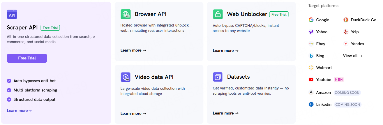 - Scraping API: We encapsulate complex crawler programs into simple API interfaces. Users only need to submit the target URL, and it will automatically perform anti-scraping countermeasures, page rendering, and data parsing, directly returning structured data. This greatly reduces technical barriers and operation and maintenance costs, allowing you to stably acquire high-quality data without maintaining complex crawling logic.