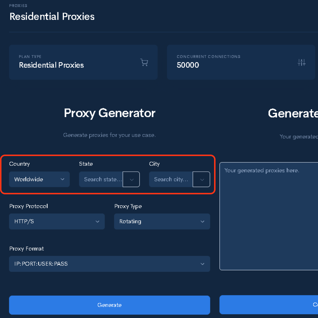 Need to simulate users from a specific region? PlainProxies lets you choose proxies by country, state, or city with just a few clicks.