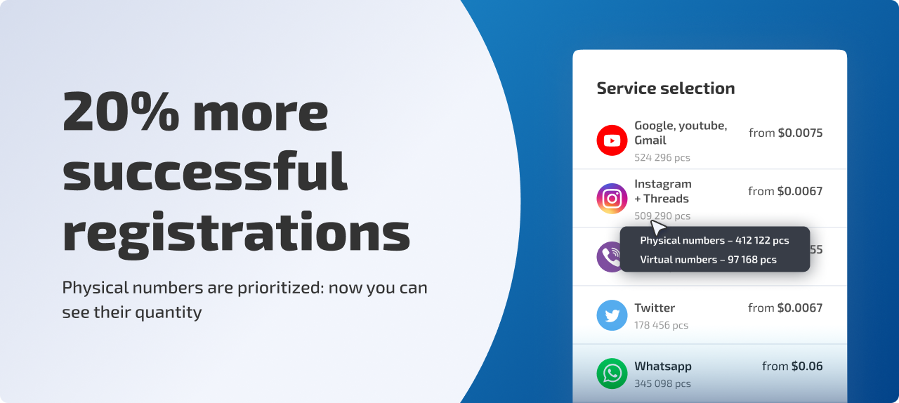 Due to the new SMS-Activate policy, physical numbers are provided to all users first. Virtual ones are available only in the absence of physical numbers. This has allowed the service to increase the number of successful sms activations by 20%.