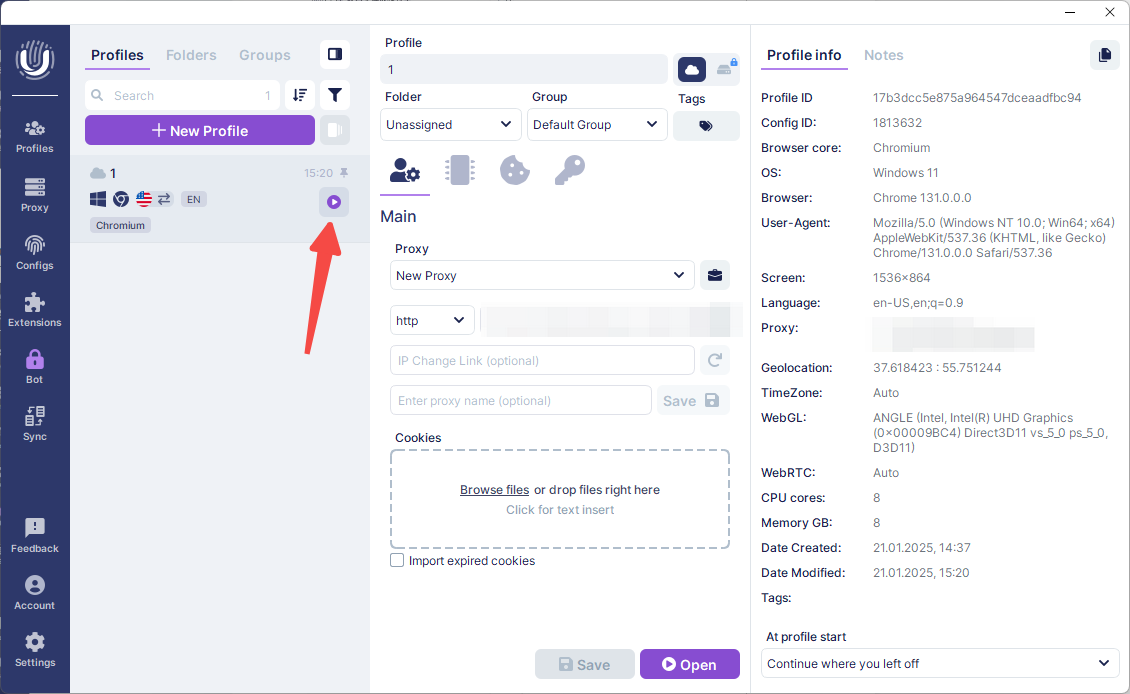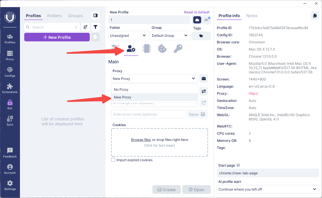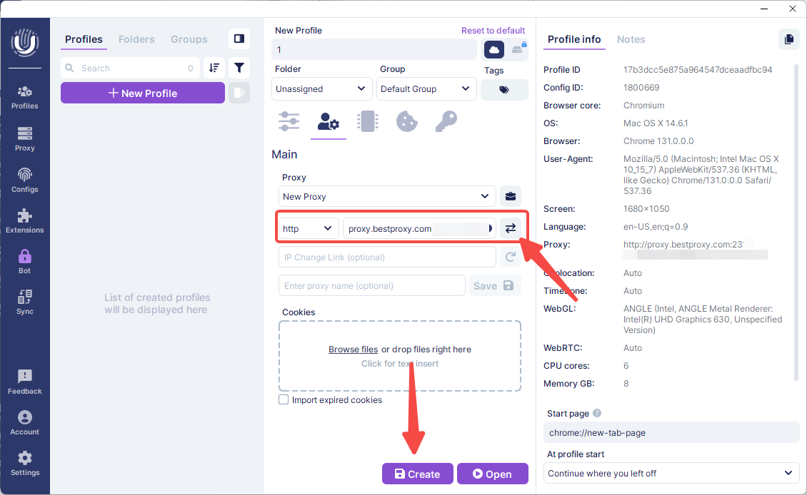 - Selecione HTTP ou SOCKS5 e insira as informações do proxy no formato: [Servidor Proxy: Número da Porta: Nome de Usuário: Senha]. Após inserir os detalhes, clique no botão "⇆" à direita para verificar o proxy. Por fim, clique em "Criar" na parte inferior.