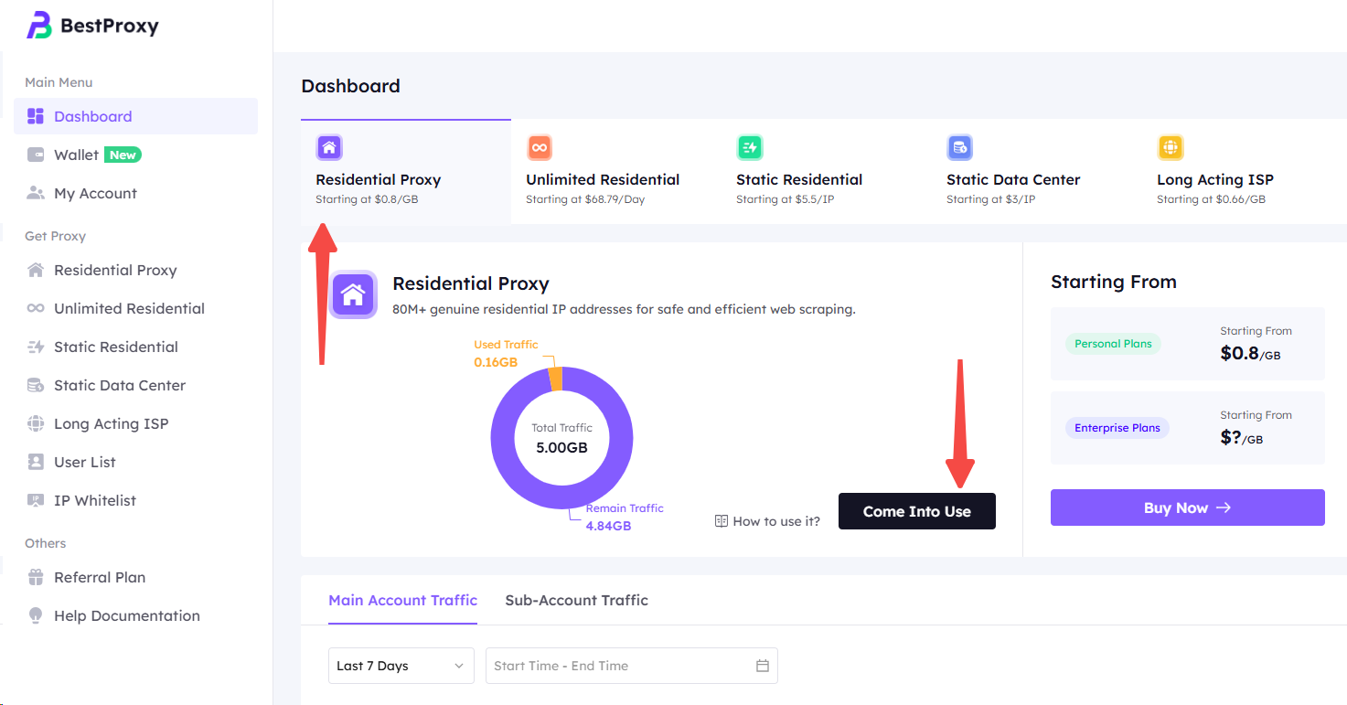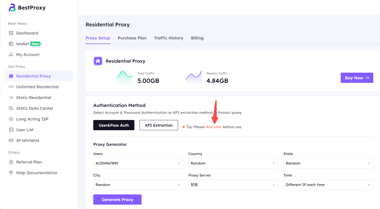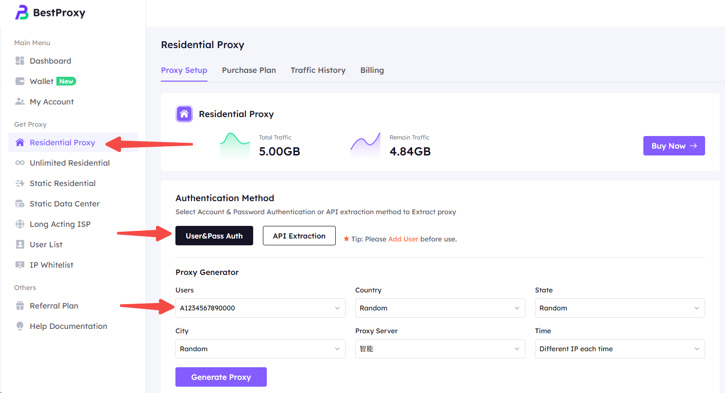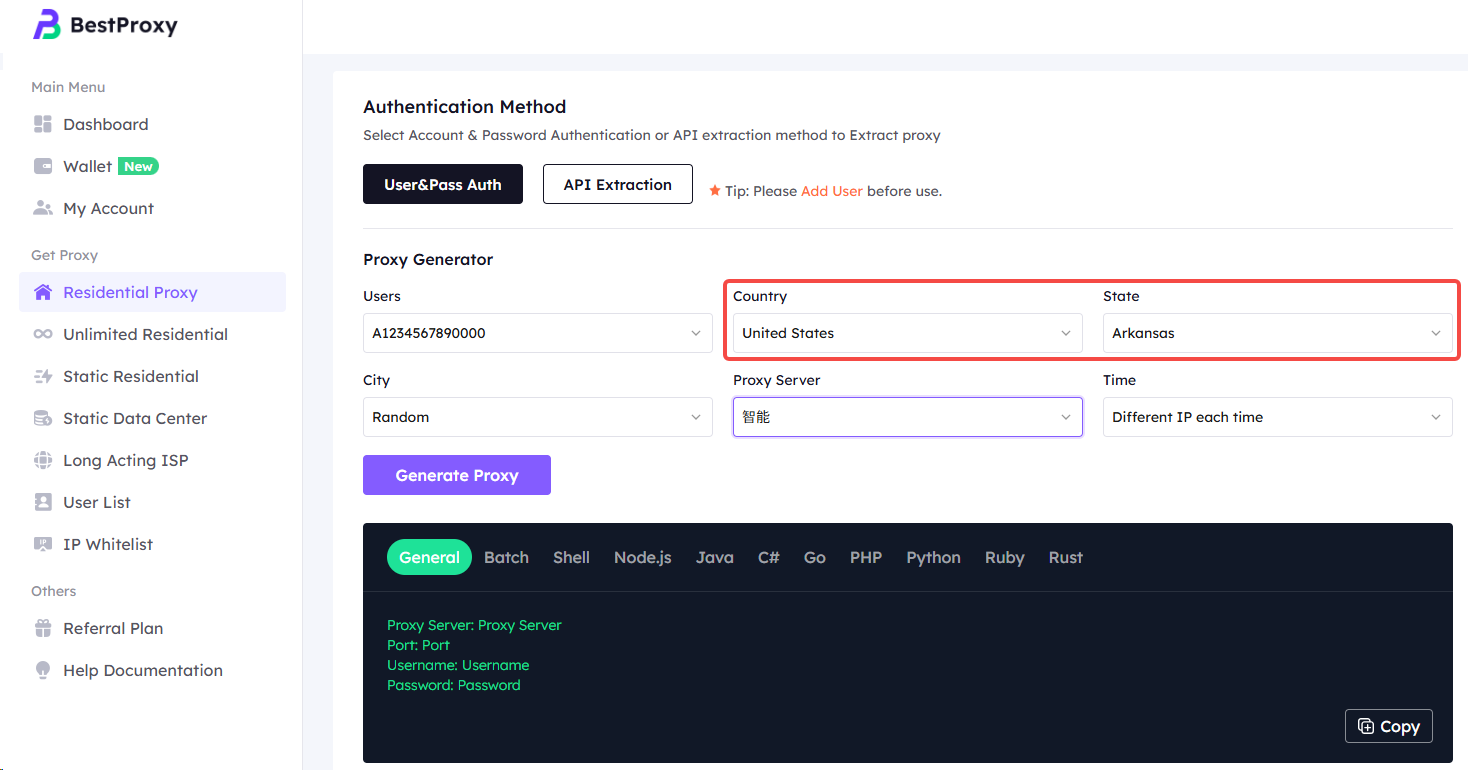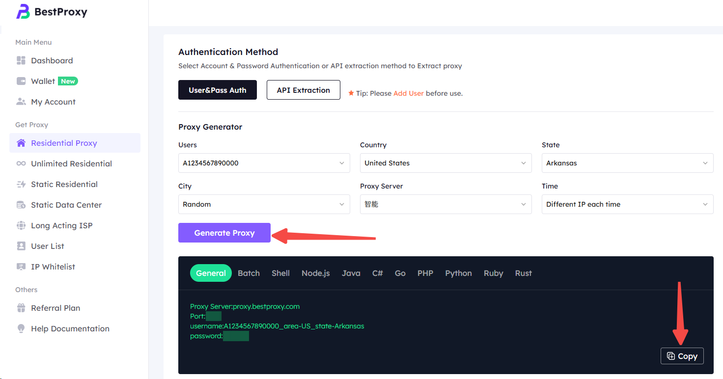 O BestProxy oferece dois métodos para extrair proxies: extração de conta/senha e extração de API. Aqui, iremos utilizar a extração de conta/senha de proxy residencial dinâmico como exemplo.