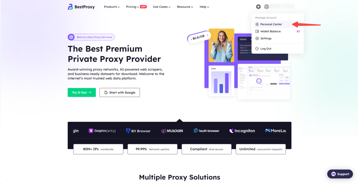 - Primeiro, acesse o site oficial do BestProxy e clique em seu nome de usuário no canto superior direito para acessar a interface do centro pessoal abaixo.