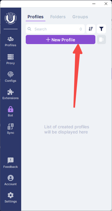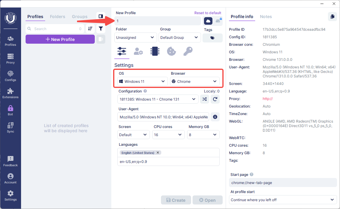 - Insira um nome para o novo perfil de usuário, em seguida selecione o sistema operacional e navegador.