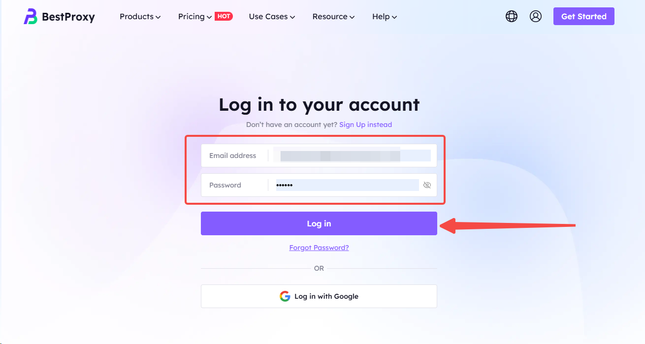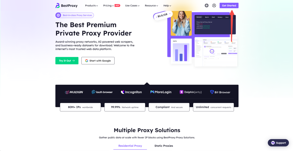 - Abra o website oficial do BestProxy, clique em "Começar" no canto superior direito, ou clique aqui.