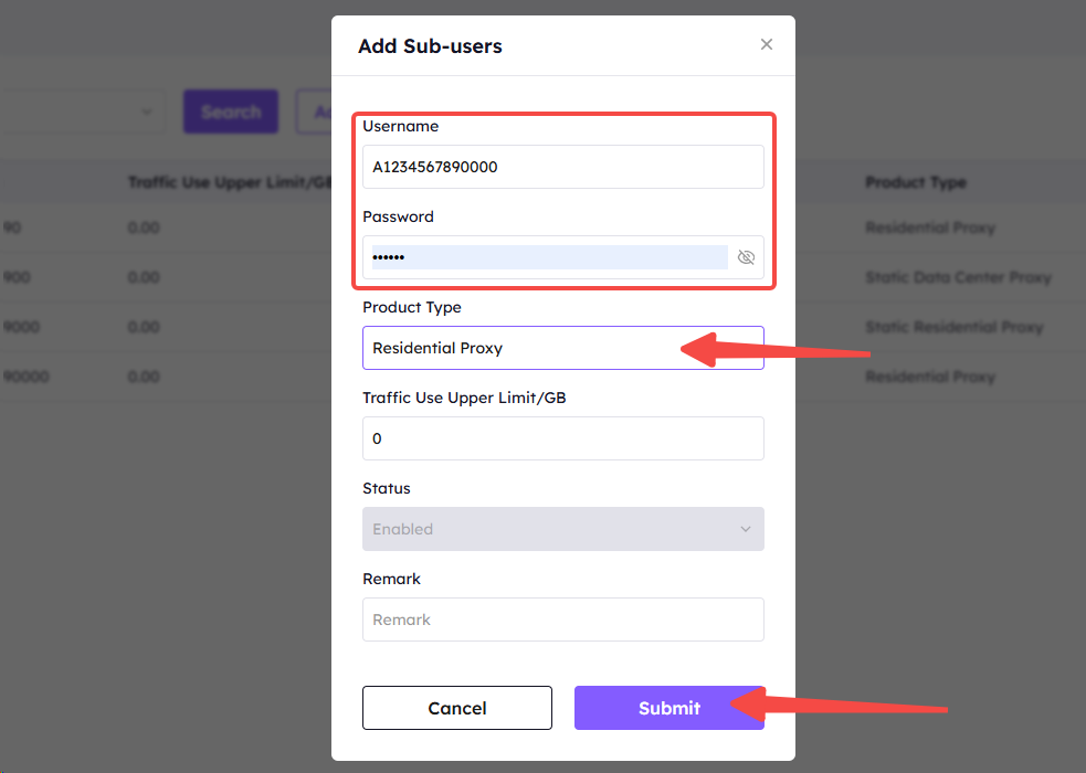 - Após clicar, uma janela de adição de subusuário aparecerá. Em seguida, insira o nome de usuário e a senha, selecione Proxies Residenciais, defina o limite de uso de tráfego (0 significa sem limite) e, finalmente, clique em Enviar.