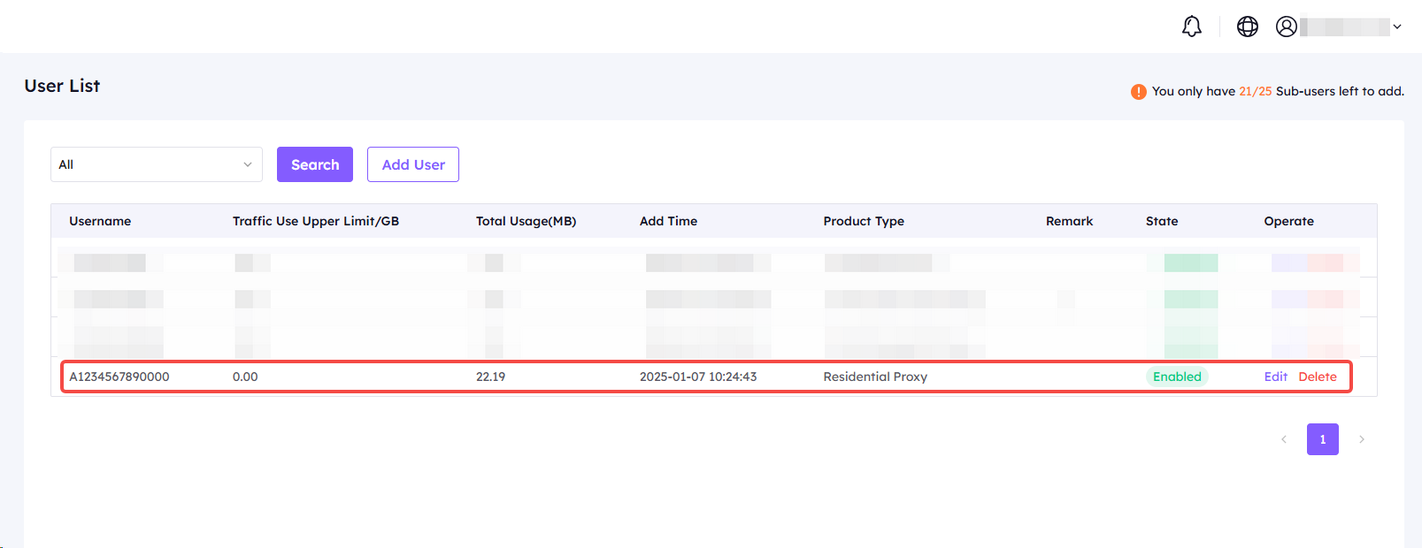 - Isso adicionará com sucesso um sub-usuario. Na extrema direita, você também pode editar e excluir o usuário.