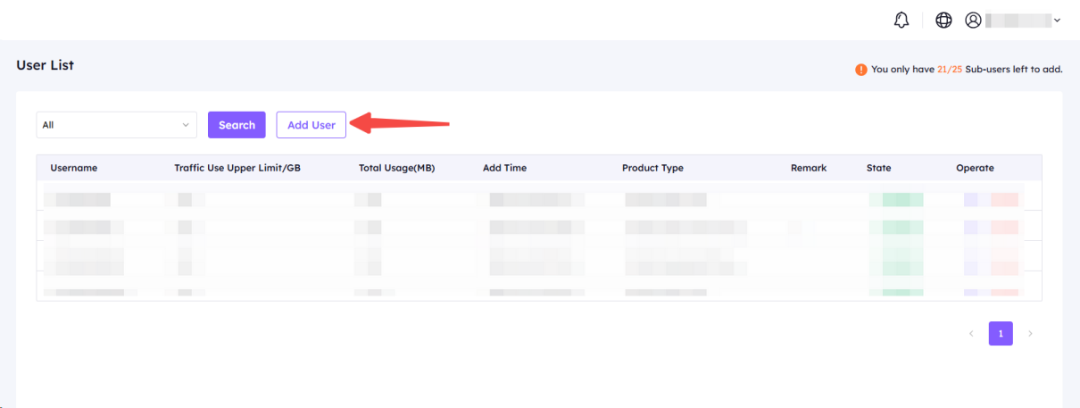 - Antes de usar a extração de conta/senha, você precisa adicionar um subusuário. Após entrar, clique em "Adicionar Usuário".