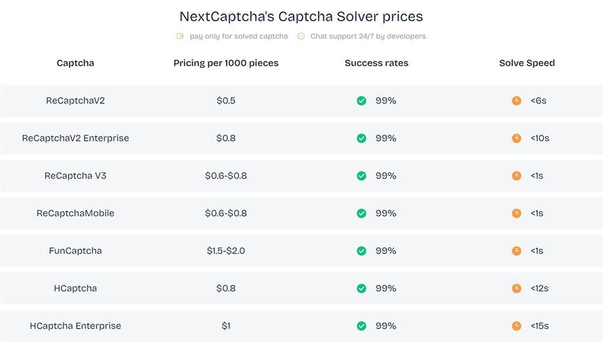 - Confiabilidade: O desempenho consistente do NextCaptcha garante que as empresas possam confiar no serviço para lidar com suas necessidades de resolução de CAPTCHAs sem problemas frequentes ou tempos de inatividade.