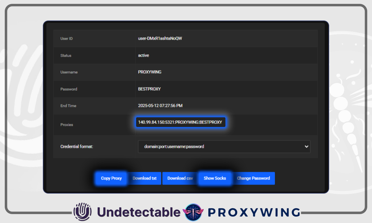 Oferecemos muitas ferramentas gratuitas, como um testador de proxy para verificar a funcionalidade dos seus proxies e um conversor de formato para alterar seu formato conforme sua preferência. No seu painel pessoal, você pode selecionar e pagar rapidamente por quaisquer proxies usando vários métodos de pagamento. Após o pagamento, no cartão do produto, você pode alternar o protocolo de proxy entre HTTP e SOCKS5.