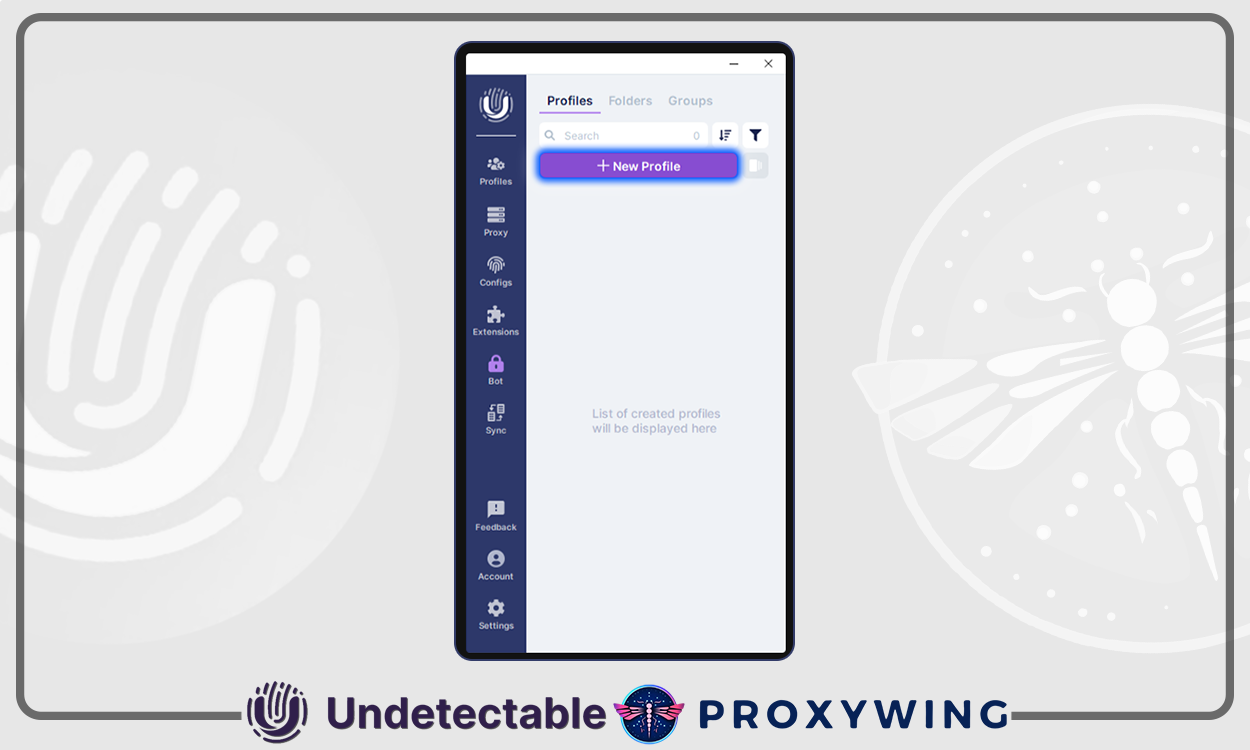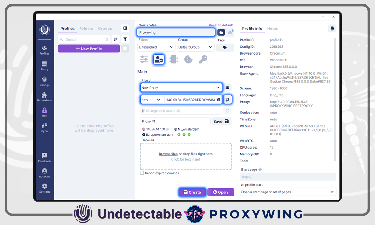 Insira um nome de perfil e vá para a seção de configurações de proxy. Cole os dados que você copiou da página do produto ProxyWing no campo de proxy.