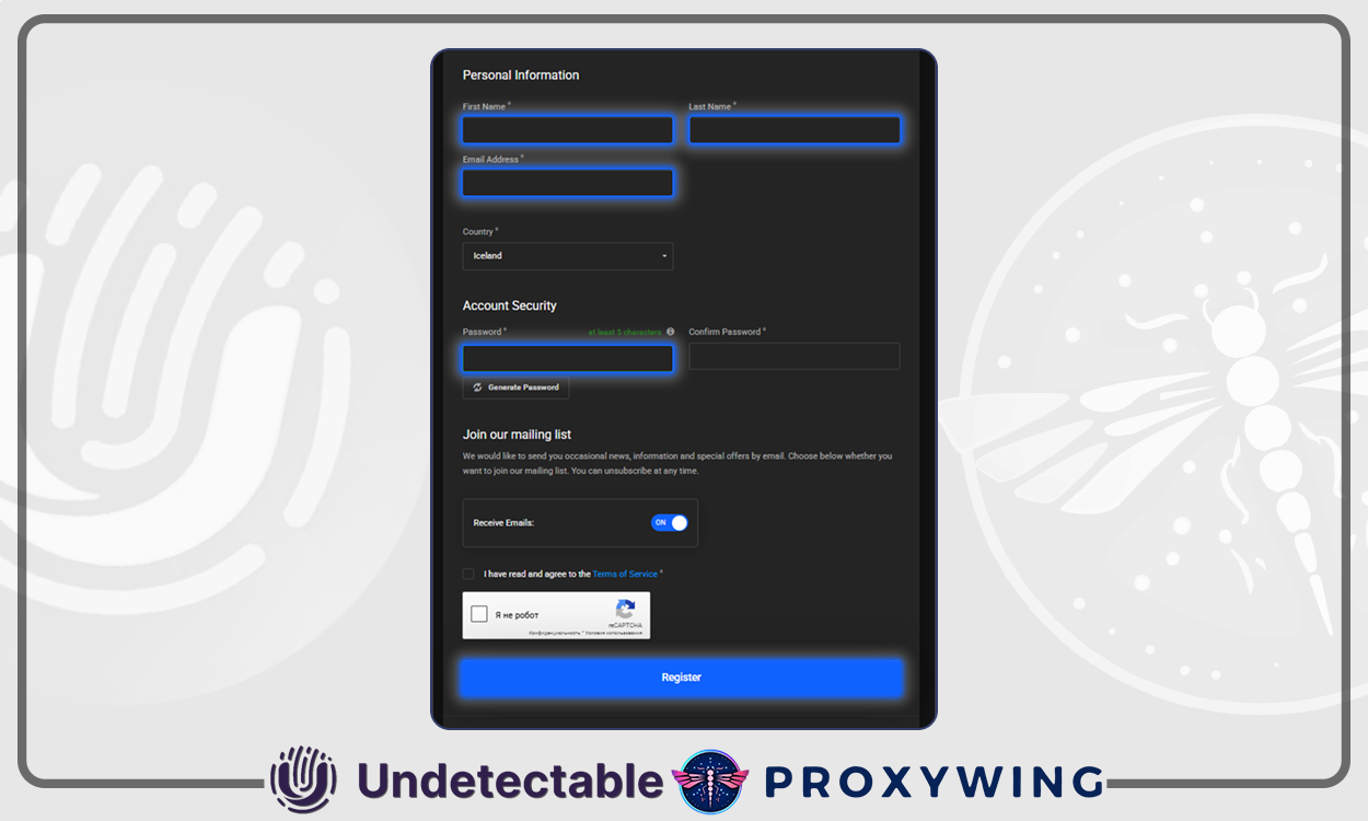 Registre-se no site ProxyWing. Insira seu e-mail, nome, sobrenome e crie uma senha.