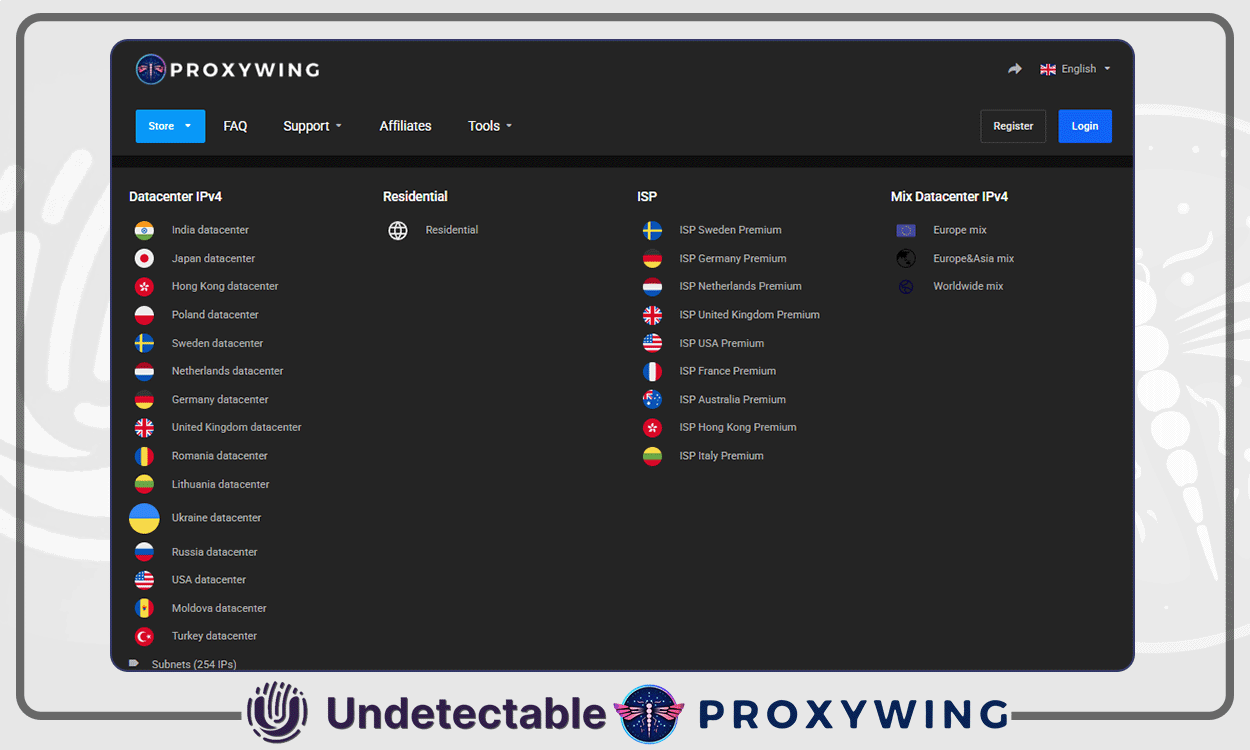 Datacenter. Proxies de datacenter são uma ótima escolha quando velocidade, baixo custo e grandes pools de IPs estáticos são importantes (por exemplo, para scraping ou automação). A ProxyWing não oferece um proxy compartilhado.