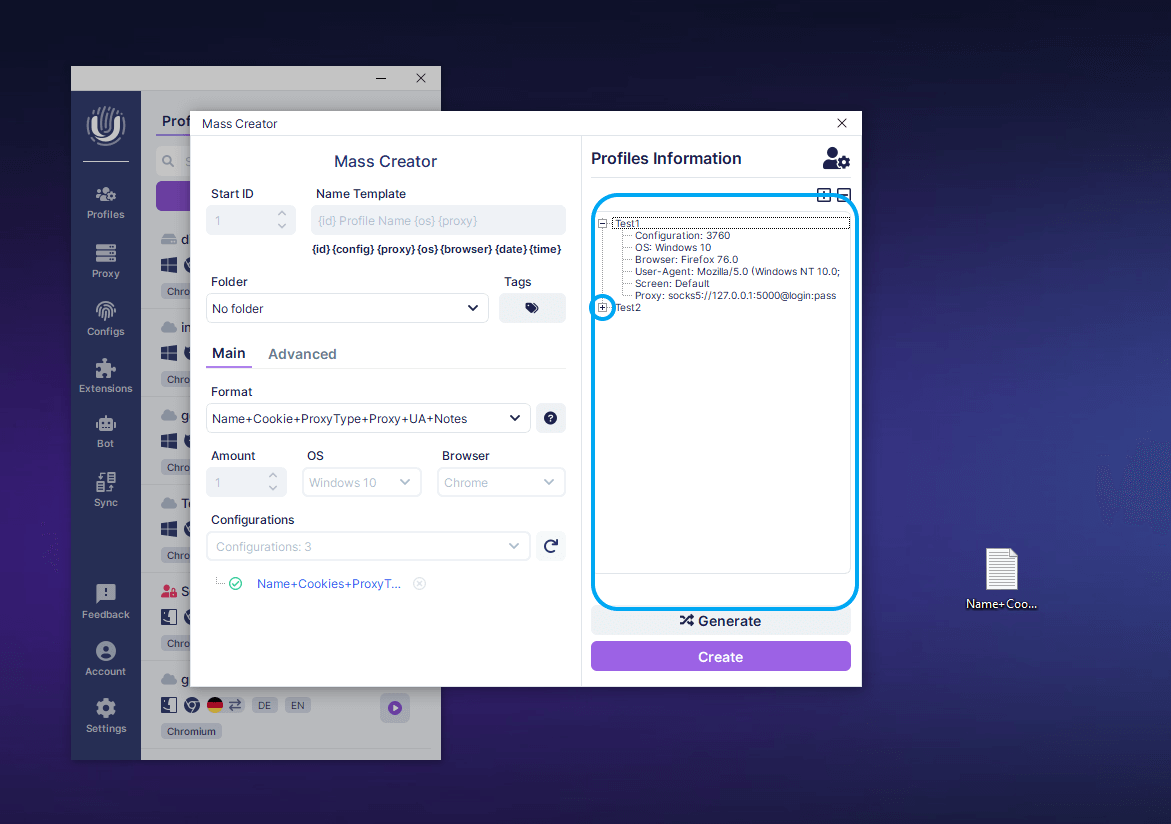 В этом разделе мы подробно рассмотрим как создавать много профилей на основе файлов содержащих информацию о cookies, UA, прокси и их типе, гео.