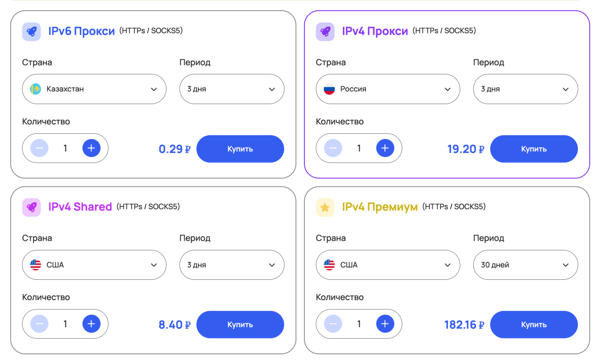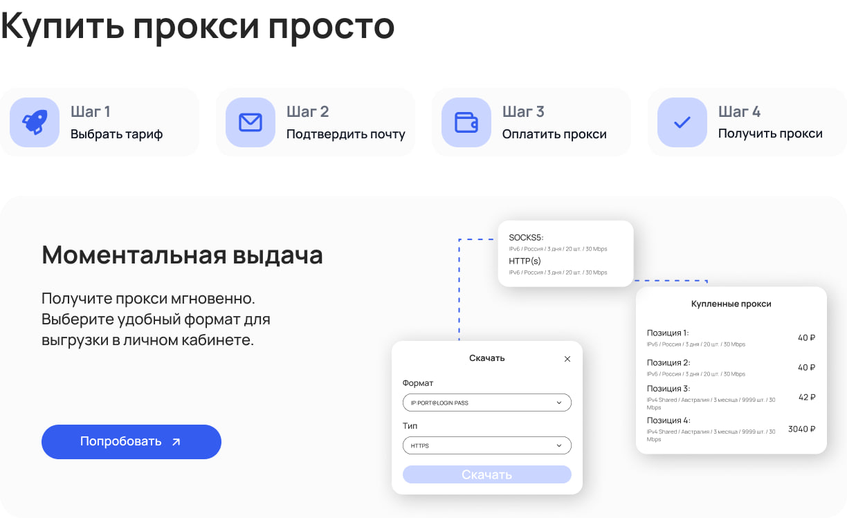 Стоимость IPv6-прокси стартует всего с 0,29 рубля, а IPv4 — от 19 рублей. В продаже доступны несколько видов: индивидуальные IPv4, shared-IPv4, IPv6, а также высокоскоростные премиум-прокси для особых задач.