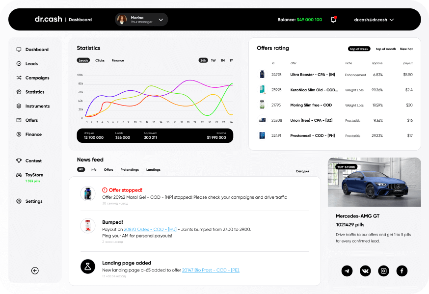Перейти на сайт партнёраDr.cash – это одна из старейших (более 8 лет на рынке) международных CPA сетей со специализацией на нутра вертикали. На текущий момент в партнёрке представлены более 2000 офферов в форматах COD, SS и Trial + Upsell в более чем 240 ГЕО в том числе экзотических и эксклюзивных.