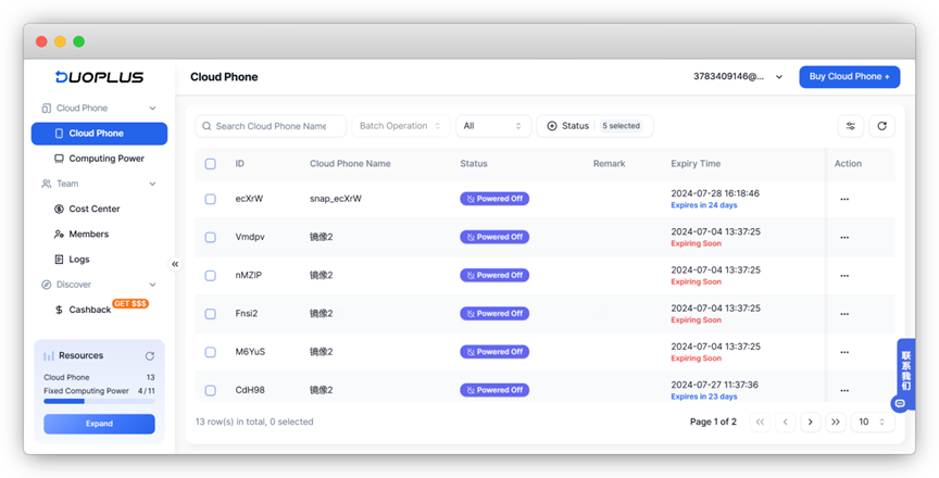 - Неограниченный доступ к облачным мобильным телефонам поддерживает матрицу маркетинговых аккаунтов, упрощая операции без необходимости частой смены устройств. Это снижает затраты, связанные с закупкой мобильных устройств и трудозатратами, позволяя одному человеку за компьютером эффективно управлять несколькими аккаунтами и способствуя командной работе для повышения операционной продуктивности.