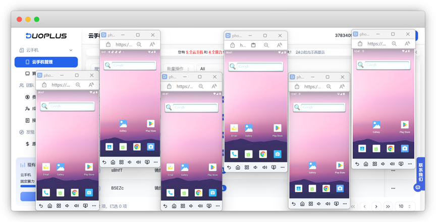 Эта технология преодолевает ограничения физических мобильных телефонов, позволяя управлять несколькими виртуальными телефонами с одного устройства. Интерфейс каждого облачного телефона напоминает интерфейс обычного мобильного телефона, что упрощает такие операции, как управление зарубежными аккаунтами, проведение прямых трансляций для электронной торговли, взаимодействие в социальных сетях и продвижение бизнеса — все это без необходимости покупки нескольких физических устройств.