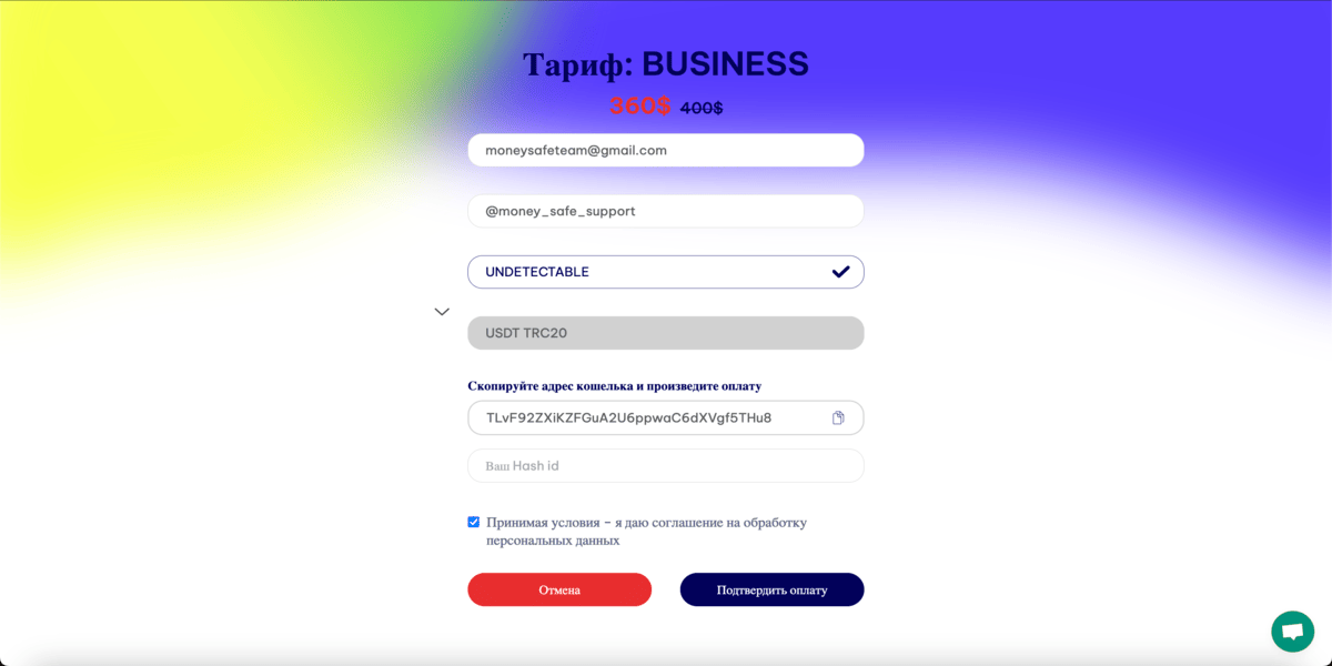 - Кликаем на кнопку “Создать White Page” и нас перекидывает в следующее окно, где следует указать краткую информацию - email, контакт для связи, далее вставить промокод UNDETECTABLE и выбрать способ оплаты. На данный момент, сервис Money Safe принимает платежи только криптовалютой. Далее делаем перевод по реквизитам, вставляем hash id (не обязательно), принимаем условия и подтверждаем оплату.