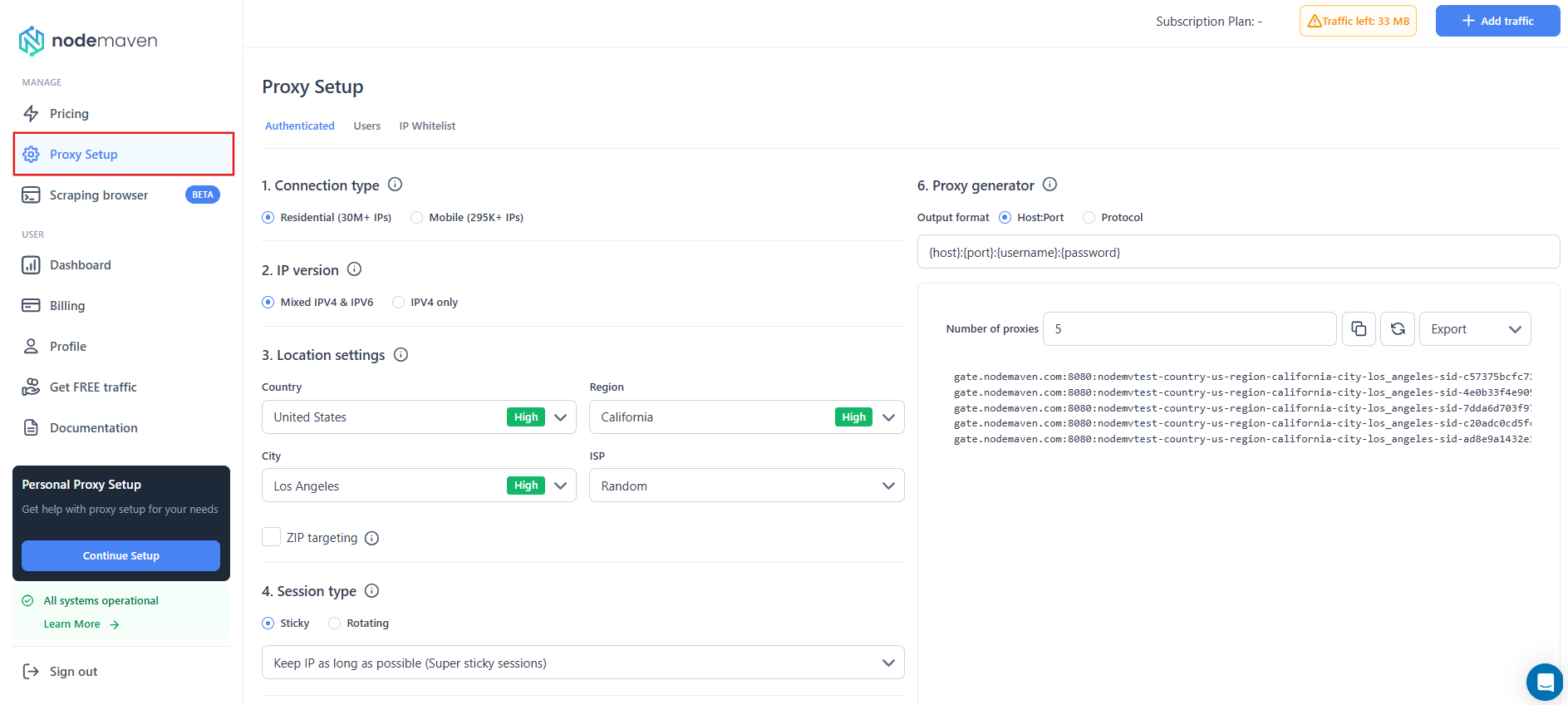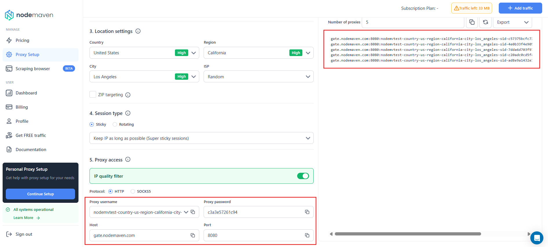 - Получите данные прокси: Войдите в аккаунт NodeMaven и скопируйте данные с дашборда