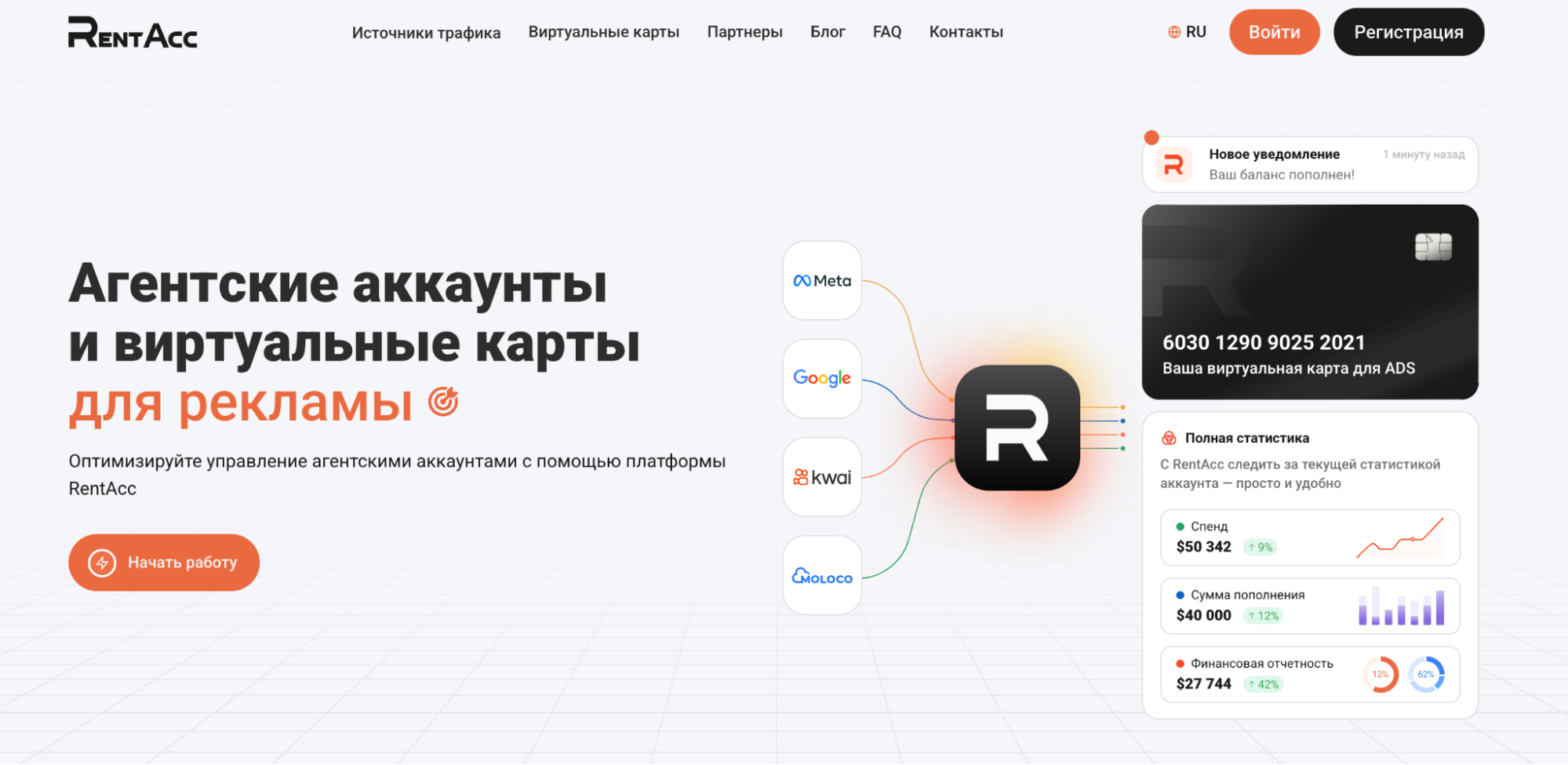 RentAcc — сервис аренды агентских аккаунтов и виртуальных карт с автоматизированной платформой для моментального пополнения и получения аккаунтов.