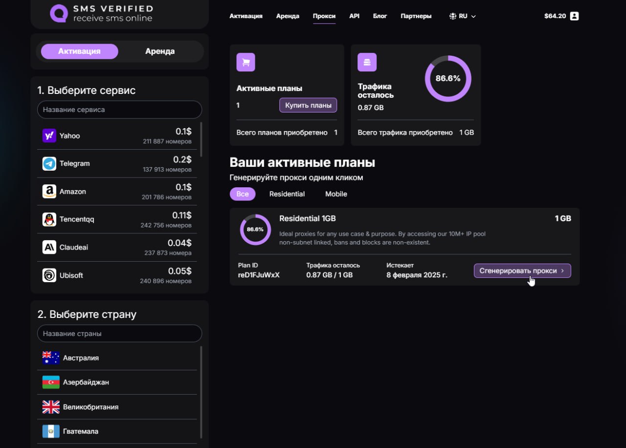 Чтобы улучшить пользовательский опыт, SMS Verified предлагает резидентские и мобильные прокси для удобного управления аккаунтами и неограниченного доступа к веб-ресурсам. Прокси позволяют: