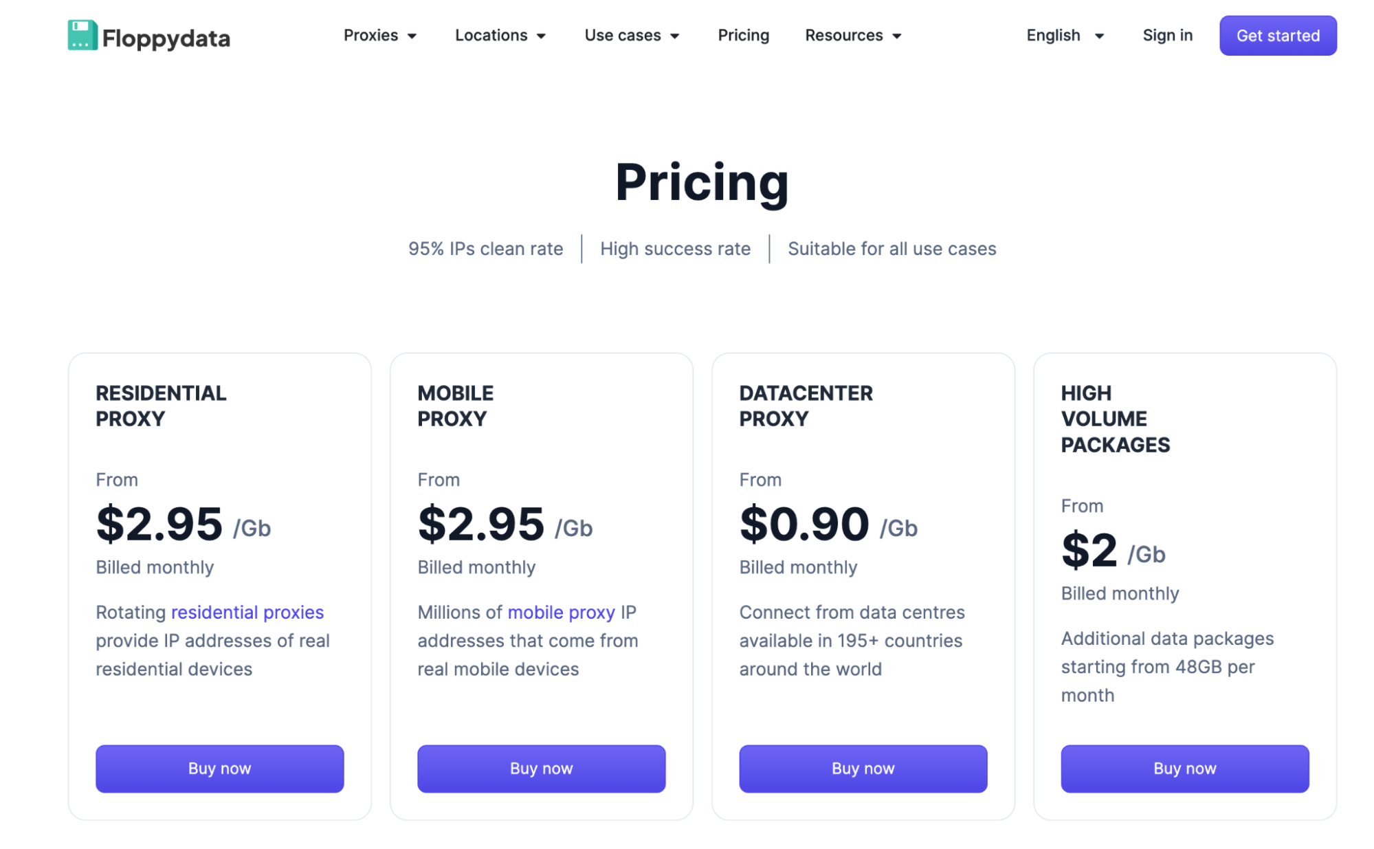 Floppydata使用简单透明的定价模式:只需为使用的流量付费,无速度或并发限制。
